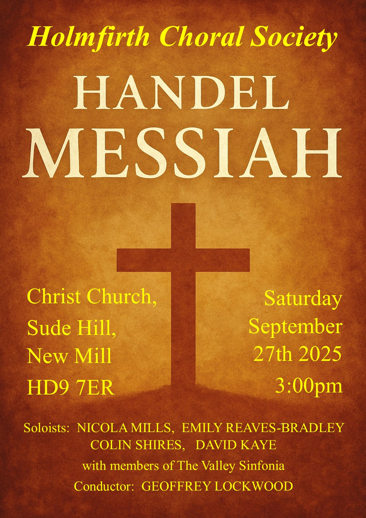 Our 2025-26 season started with a performance of Handel’s most popular oratorio, Messiah. Perhaps unusually, this was a September matinée performance, on 27th September, at Christ Church, New Mill. A small group of instrumentalists from The Valley Sinfonia (led by Mary Barber) provided the accompaniment, and the soloists included internationally acclaimed operatic soprano Nicola Mills, with Emily Reaves-Bradley (who is a long-serving musical director of Honley Ladies’ Choir, and has sung solo for us previously), Colin Shires (a Mrs. Sunderland trophy winner) and David Kaye (of the Mastersingers) and indeed it was a memorable performance. It was conducted by Geoffrey Lockwood – his final Messiah with Holmfirth Choral before he retires in December, and Malcolm Hinchliffe was at the keyboard. The concert attracted a large and appreciative audience.